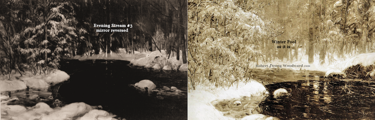 ⮟ Below is a side-by-side comparison of Winter Pool and Evening Stream #2 with Evening Stream #2 reversed as Woodward indicates in his painting diary remarks. While there is a good resemblance of the two pools being similar, the rocks do not line up at all and they do not appear to be the same rocks at all. The scene is also different in the sense that Winter Pool is right after a fresh snow, branches and leaves of the surrounding Beech trees covered.