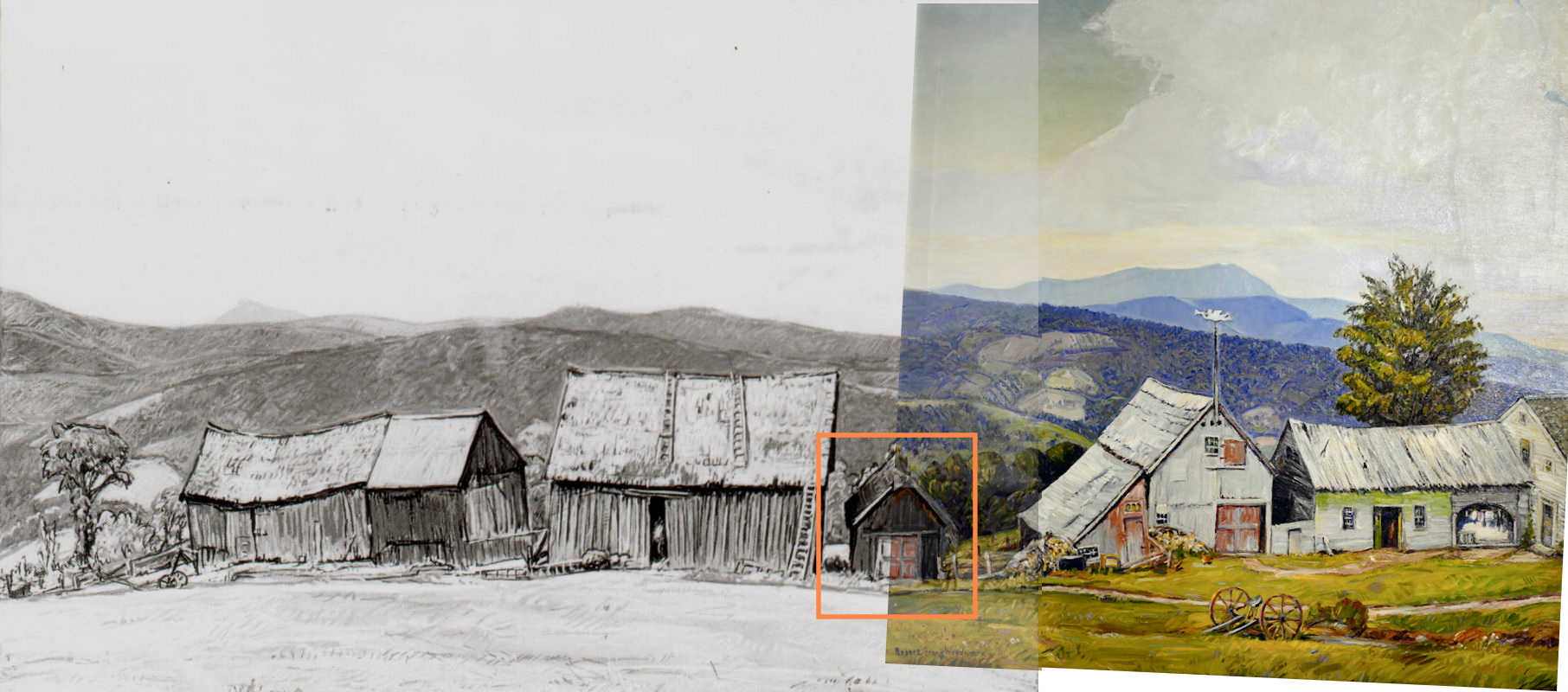We only just recently put together that five paintings of two different set of barns are all from the same farm. We have diary comments for all three oil paintings mentioning the Nortons but Woodward did not keep a record of his pastels. The two pastel paintings, Saddleback Barn and Vermont Barns (Chalk) have always been linked to Vermont Barns (Oil) because it is clearly the same "end-barn" in all three scenes. However it was never understood how In Vermont, and Up in Vermont fit into the picture. They were the barns closest to the house but where were they in relation to the other barns? Then we noticed that a small shed appeared in three of the five paintings. It is in both "in Vermont" canvases and one pastel. We take that shed, size and merge it with the pastel, Vermont Barns(Chalk) to make one full-length image and it all lines up. ⮟ SEE BELOW ⮟