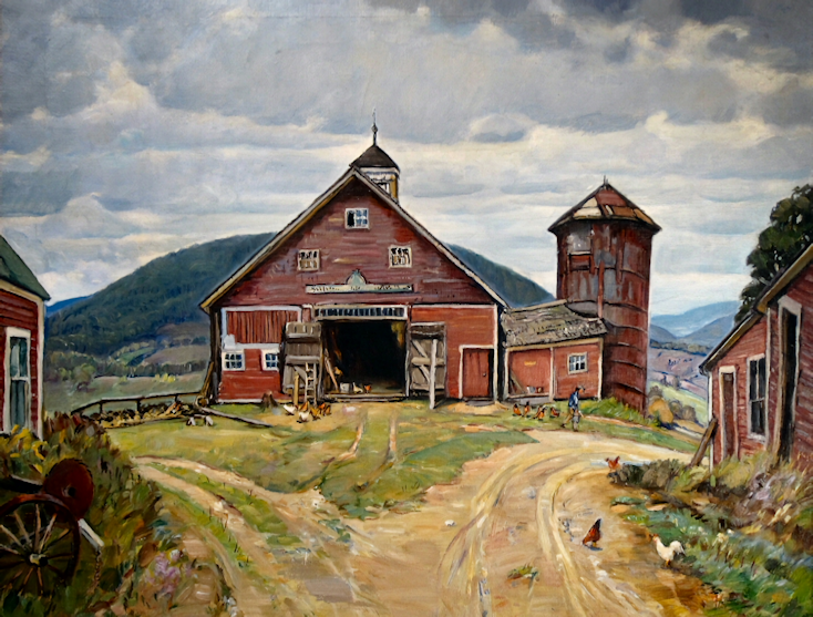"Painted in 1940. Warfield's barn and silo (since torn down) out of Charlemont. Made a chalk of this just before my fire (1934) which immediately sold at Manchester. Before sending the chalk, made a painting from it, but it was never satisfactory to me. Loving the subject matter and the silo having been destroyed so I couldn't go back to paint I finally made, in the winter of 1940, this successful 27 x 30, then destroyed the earlier canvas from which I copied it."