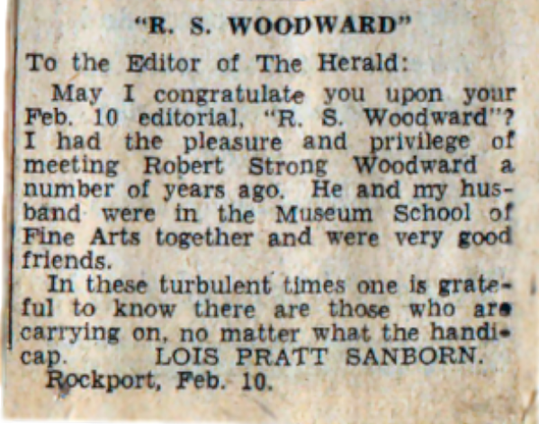 "...as if the author [Parkman] were overflowing with the zest of life. A striking recent example of the same sort of thing now comes to notice in the announcement that Robert Strong Woodward has won second prise at the show of -'Contemporary American Oils' at the Boston Art Club."