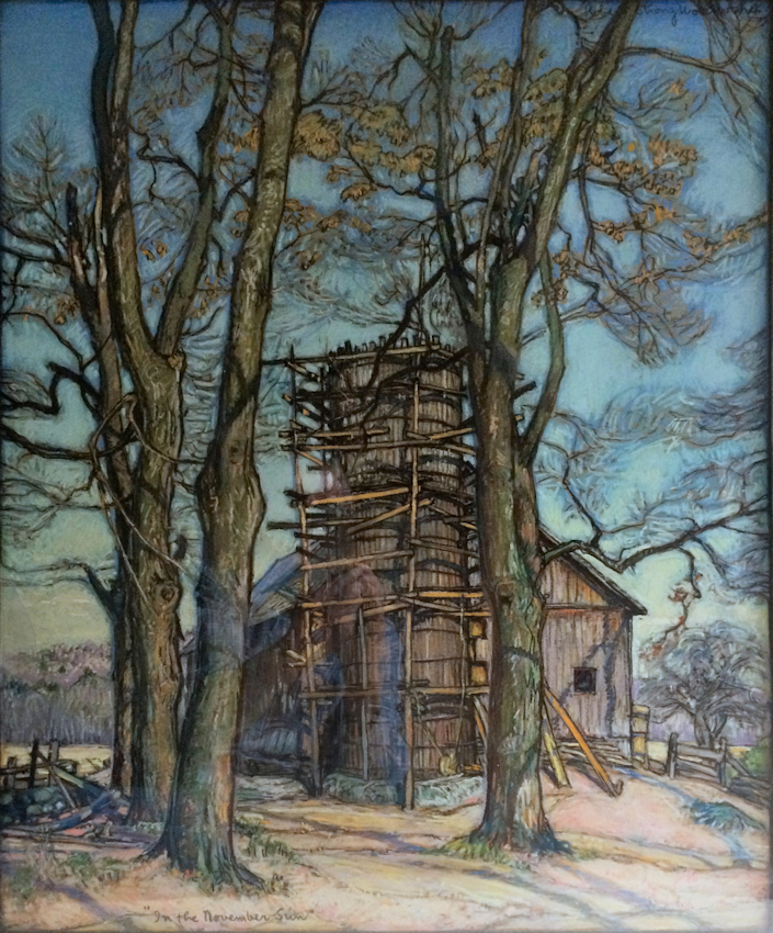 "Painted prior to 1930. All said about the picture in my diary (Across the Valley) applies exactly to this one also; in the same way it is the property of John W. Haigis. A painting of a silo with scaffolding over at the Kendrick farm and back road from Ashfield to Conway (Archibald MacLeish road). Also, made a chalk drawing of the same subject."