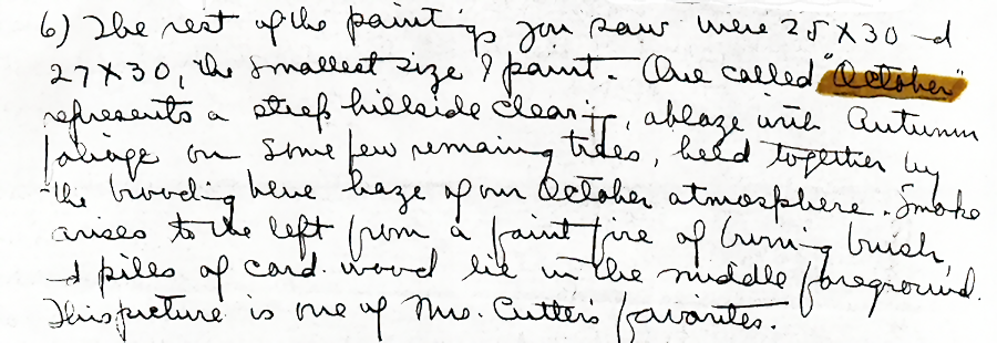 "The rest of the paintings you saw were 25 x 30 and 27 x 30, the smallest size I paint. One called "October" represents a steep hillside clearing ablaze with autumn foliage on some few remaining trees, held together by the brooding blue haze of our October atmosphere. Smoke arises to the left from a faint fire of burning brush and piles of cord wood lie in the middle foreground. This picture is one of Mrs. Cutter's favorites." ⮟