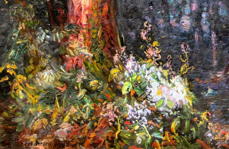 Below is a closer look at the finer details at the base of the tree in the left of the painting, along with a good look at RSW's signature including Strong sans the red "S."