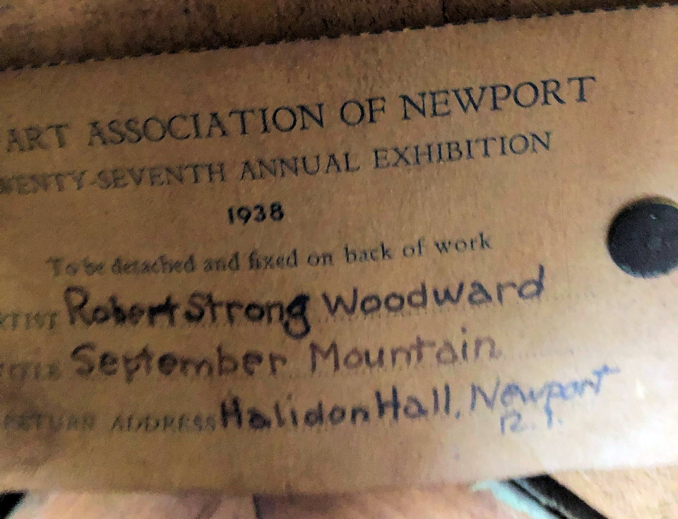 Below is a picture of a label still attached to the painting's stretcher. It is from the 1938 art exhibition for the Art Association of Newport. Today the association is now, simply, The Newport Art Museum. The label also offers the name of the painting, as well as its "Return Address," being simply, "Halidon Hall, Newport, R.I." ⮟