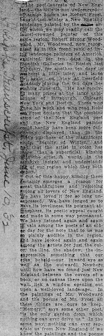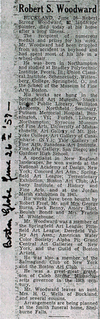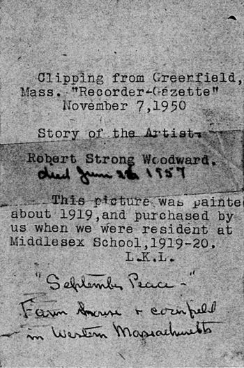 A note on the back says "...was painted about 1919 and purchased by us [my grandparents], when we were resident at Middlesex school, 1919-1920." The date next to Woodward's signature on the front of the painting says 1918. There is an old card nailed to the back of the painting which does call it September Peace. The outside of the stretcher frame measures 27" x 30". Could it be the smaller painting to which the diary entry on the website refers? The outside of the frame on this painting measures 34" x 37".
