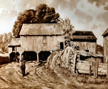 "Painted in 1945. A painting made in the studio for my G.C.A.G. Exhibition in New York in the spring of 1945. Made from an earlier 25 x 30 which was not perfect technically and which I destroyed after copying it, as above, made in West Hawley of a picturesque old barn set over ledges, the farm of Mr. Stetson. Figure of old man with pail in the barn yard, and figure of (smaller) man watering old white horse at watering trough."