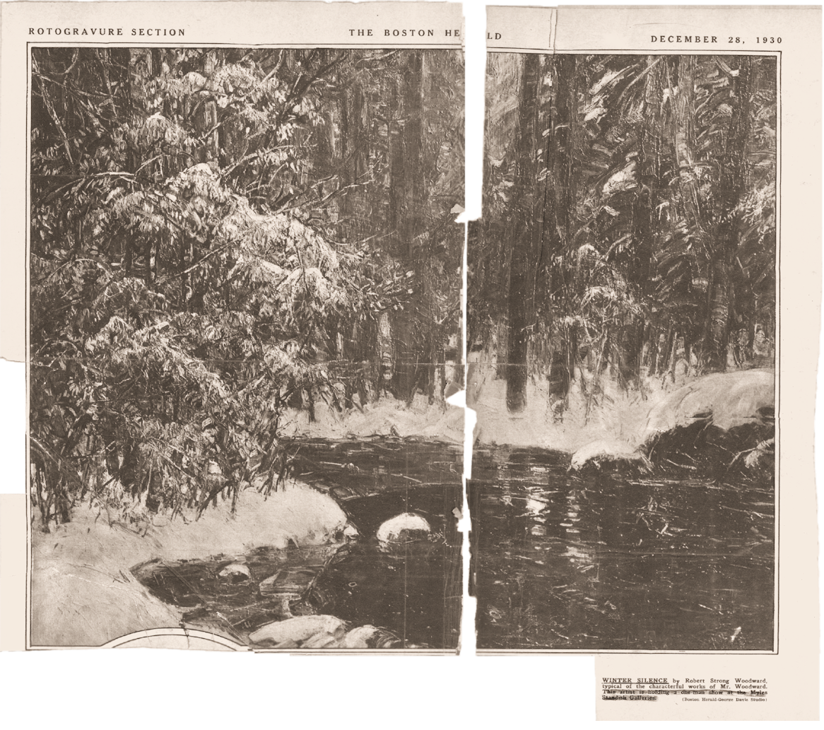 ⮟ Below is the Rotogravure page from the December 28, 1930, Boston Herald. You will see the damage it incurred by being glued over two pages of his Scrapbook, yet still, you can clearly see the caption that says "Winter Silence" , below it.