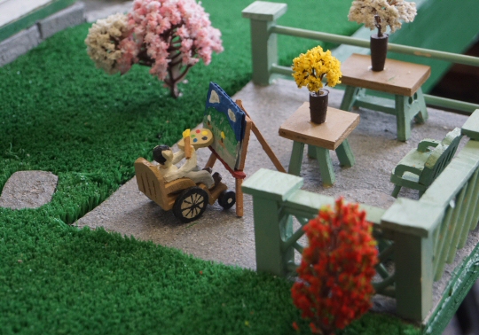 The patio terrace with tables, bench, and miniature artist in a wheelchair