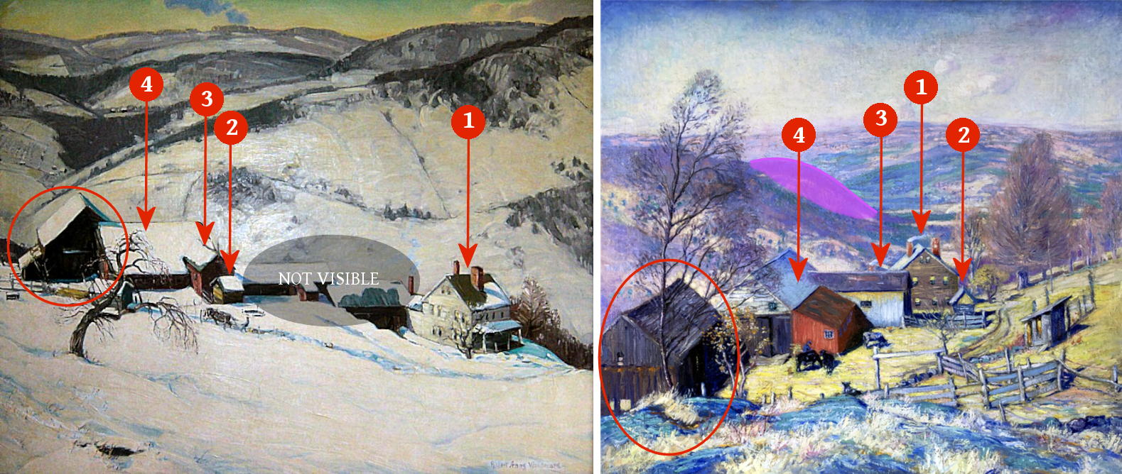 ② The Small Shed: Appears to be the same color, size and location in both paintings, though the fence