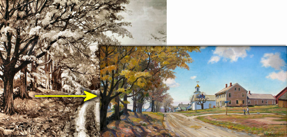 This is the painting that would be the basis of what is the composite painting Village Street. Woodward assembled (the reason he called them composites) the tree line of Falling Gold with the right side of this painting to make Village Street illustrated below.
