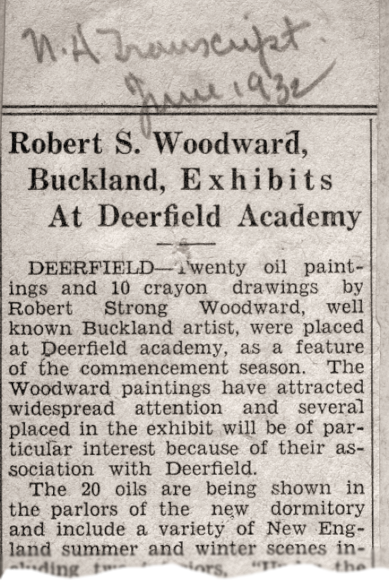 To the Left: An article clipping from the New Hamphire Transcript regarding RSW's exhibition at the Deerfield Academy (1932). It is one of 12 oil paintings mentioned in the article and one of 20 oil paintings and 10 chalk drawings exhibited.