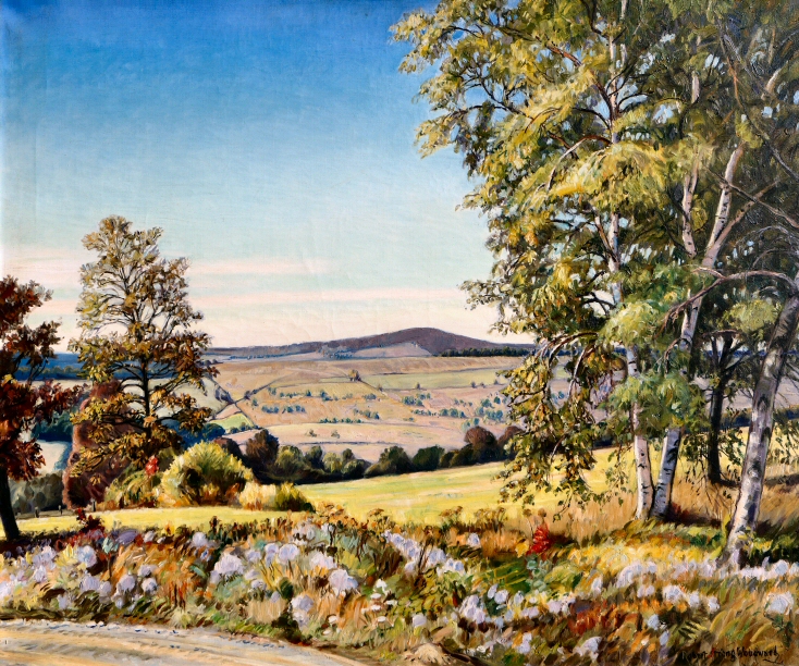 filled in right half of the canvas, green mowing beyond, over which bands of pasture land, topped by a