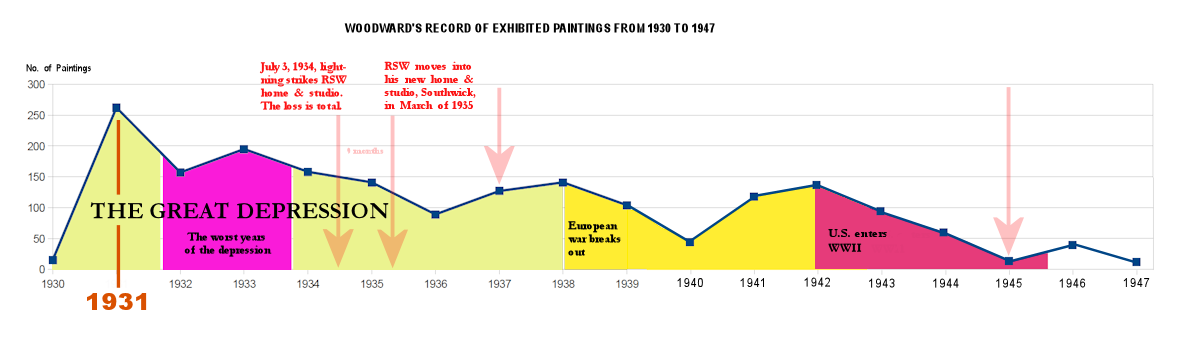 A LINE GRAPH OF THE TOTAL NUMBER SPOTS "PAINTINGS" FILLED FROM 1930 TO 1947![]() The line graph above needs some explanation. The numbers are how many exhibit spots